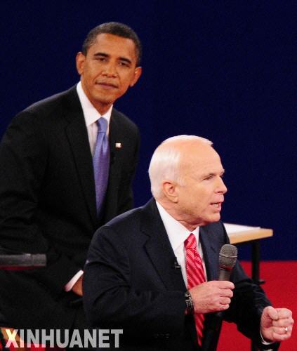 10月7日,美国民主党总统候选人、伊利诺伊州国会参议员奥巴马(左)与共和党总统候选人、亚利桑那州国会参议员麦凯恩在位于田纳西州纳什维尔市的贝尔蒙特大学举行今年大选的第二场总统候选人辩论。 新华社记者张岩摄