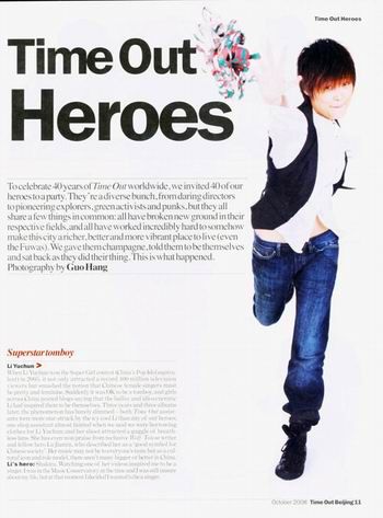 李宇春登《Time Out》封面在荣登美国《时代周刊》及英国《Glamour》等众多国际知名杂志封面之后,李宇春近日再被英国知名杂志《TIME OUT》选中,作为该杂志40周年的北京特刊封面人物,与章子怡、陈凯歌、崔健等同时出现在中国版的英文刊封面上。