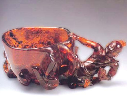 王春云:历史上曾共发掘出三只琥珀杯。特别值得一提的是,1821年在英国布莱顿附近的古墓穴中发掘出来的后茯琥珀杯(Hove cup)。它的杯体由一整块血红色琥珀精雕细刻而成,内外抛光非常均匀,直径大约9厘米,有一个小把手,杯口处还有8个漂亮的小圈。表面已经出现裂缝,但整体保存完好。后茯琥珀杯的制作年代为铜器时代,大约相当于中国的晚商时期,靠近西周早期。另外两只琥珀杯是70年代我国考古发掘出来的,目前收藏在南京博物院,一只为血珀杯,另一只为白珀杯。