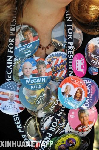 10月25日,在美国新墨西哥州的阿尔伯克基,一名支持者挂满共和党正副总统候选人麦凯恩和佩林的徽章,出席共和党总统候选人竞选集会。 新华社/法新