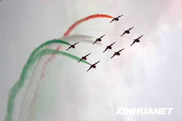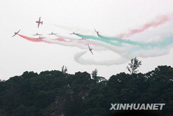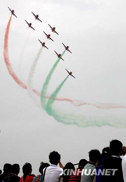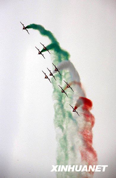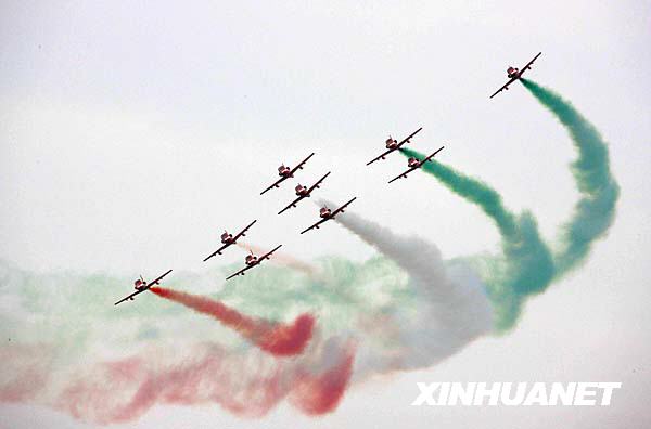 当日,印度空军“阳光”特技飞行表演队的空中勇士们驾驶9架教练机,在珠海的天空上进行精彩绝伦、扣人心弦的9机编队表演,演绎各种高难度编队飞行动作,令现场的观众如痴如醉。 新华社记者王建民摄
