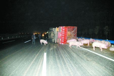 拉猪车侧翻,30多头猪撒欢儿高速路