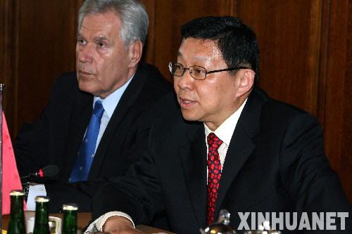 11月10日,中国商务部长陈德铭(右)和德国联邦经济与技术部长格洛斯在德国首都柏林回答记者提问。当日,中德经济合作联委会第14次会议在柏林召开,双方就中德、中欧经贸关系、全球经济形势及多哈回合谈判等共同关心的问题交换了意见。 新华社记者王勍摄