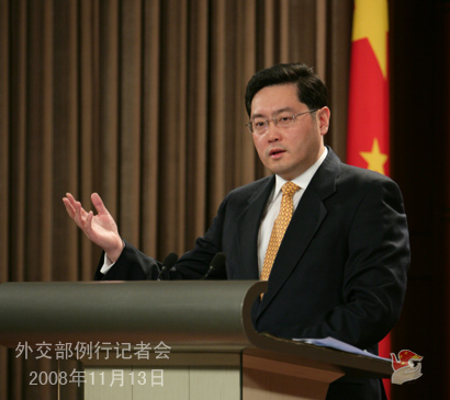 2008年11月13日,外交部发言人秦刚举行例行记者会,就胡锦涛主席出席20国集团领导人金融市场和世界经济峰会、六方会谈等答问。