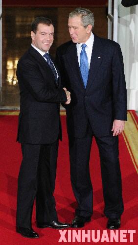 11月14日,美国总统布什(右)在白宫迎接前来出席二十国集团领导人金融市场和世界经济峰会的俄罗斯总统梅德韦杰夫。 新华社记者张岩摄