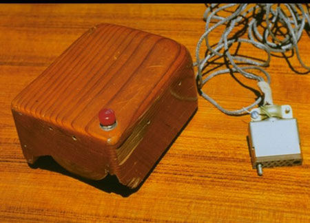 首个鼠标:外面有一层木板,拖着一条连接线,下面装有滚轮。