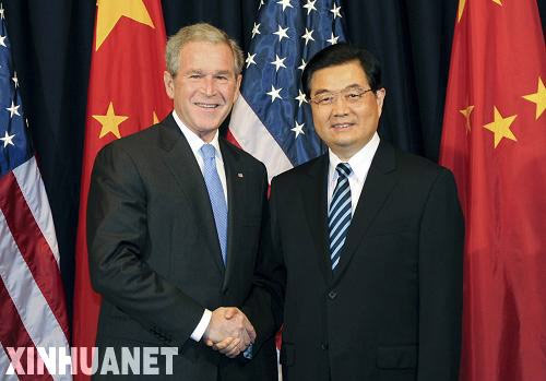 11月21日,国家主席胡锦涛在利马会见布什。双方就中美关系和共同关心的应对国际金融危机、促进世界经济发展、维护世界和平等重大国际和地区问题深入交换了意见。新华社记者樊如钧摄