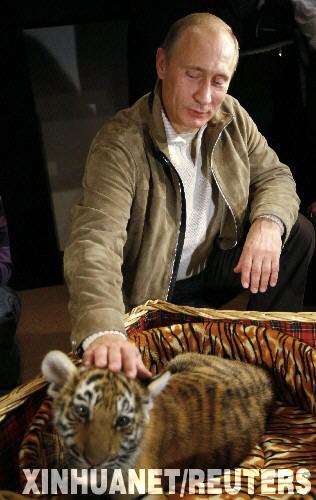 资料图片:10月10日,俄罗斯总理普京在首都莫斯科郊外的住所展示他的生日礼物——一头两个月大的虎崽。新华社/路透