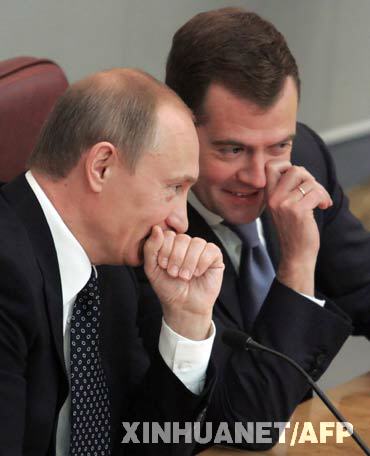 资料图片:5月8日,俄罗斯总统梅德韦杰夫(右)与总理普京在俄罗斯国家杜马全体会议上交谈。当天,俄罗斯国家杜马(议会下院)举行非例行全体会议,批准了新总统梅德韦杰夫对普京出任新政府总理的提名。新华社/法新