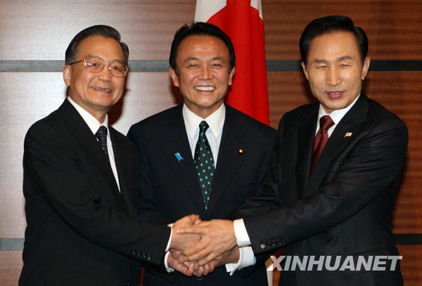 12月13日,中日韩领导人会议在日本福冈举行。这是中国国务院总理温家宝、日本首相麻生太郎、韩国总统李明博在会议开始前合影。新华社记者 姚大伟 摄