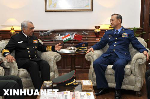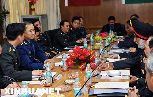 12月15日,中国人民解放军副总参谋长马晓天(右)与印军参谋长委员会主席、海军参谋长梅赫塔上将会晤。新华社记者 王晔摄