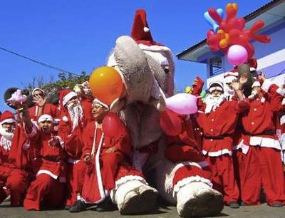 泰国今年政局动荡,新任总理阿披实上台,乱局算是暂息。泰国虽然是佛教国家,但仍然可找到圣诞气氛。大城府一间学校便请来多只穿上圣诞老人衣服的大象,其中一只更全身涂上白油,宣传“白色圣诞”。