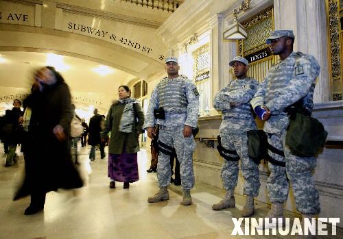 11月26日,在美国纽约的大中央车站,几名美军士兵在地铁口警戒。当日,美国联邦政府发出警告,纽约地铁和铁路系统有可能在节日期间遭到恐怖袭击,敦促当地执法部门加强安全保卫。 新华社记者 侯俊 摄