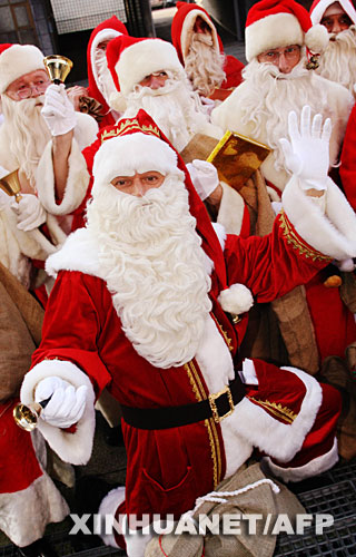 图为2007年11月22日,在德国北部城市汉堡,人们化装成圣诞老人聚集在一家职业介绍中心前。这家中心从失业者、学生以及其他希望兼职的人中招募了60名临时圣诞老人。被招募者需自己准备服装,表演2小时的报酬约为100欧元。目前,他们已经接到大约200场活动的邀请,预计圣诞节前的活动场次可达到600场。 新华社/法新