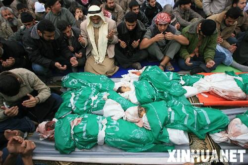 1月2日,在加沙地带北部城镇拜特拉希耶,大批巴勒斯坦人参加在以军空袭中丧生的哈马斯高级领导人尼扎尔·拉扬的亲属的葬礼。以色列对加沙地带发动的大规模空袭2日进入第7天,空袭已造成至少430人死亡。 新华社发