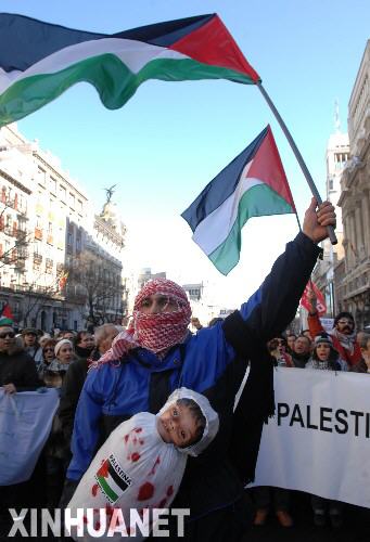 1月11日,在西班牙首都马德里,一名男子怀抱死难儿童的人偶、高举巴勒斯坦旗帜参加反战游行。当日,各界人士在马德里举行大规模反战游行,抗议以色列军队在加沙的军事行动。据组织者称,共有25万人参加了此次示威游行。新华社记者陈海通摄