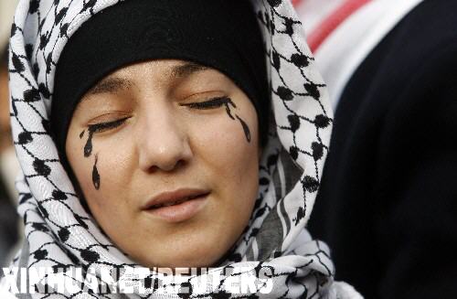 1月10日,在法国马赛举行的反战游行上,一名示威者在脸上画上黑色的眼泪。法国各大城市当天分别举行大规模反战游行活动,抗议以色列军队在加沙的军事行动,呼吁巴以双方尽快停火。法国内政部对媒体宣称,当天全国共有130个城市举行了游行,约12.3万人走上街头。新华社/路透
