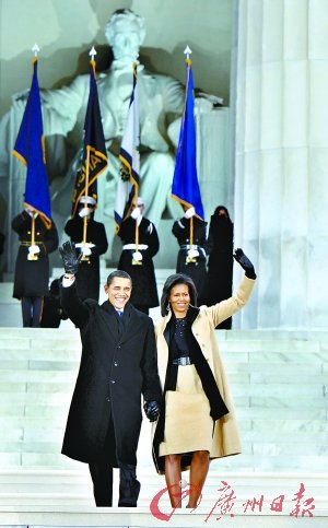 奥巴马和妻子挽手走下纪念堂台阶,身后是林肯雕像。
