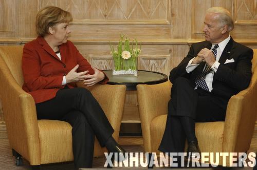 2月7日,在德国慕尼黑,德国总理默克尔(左)在慕尼黑安全政策会议上会见美国副总统拜登。为期3天的第45届慕尼黑安全政策会议6日在慕尼黑开幕。300多名政要及安全领域专家出席会议。慕尼黑安全政策会议原名世界防务大会,由德国人埃瓦尔德·冯克莱斯特在1962年创办。新华社/路透
