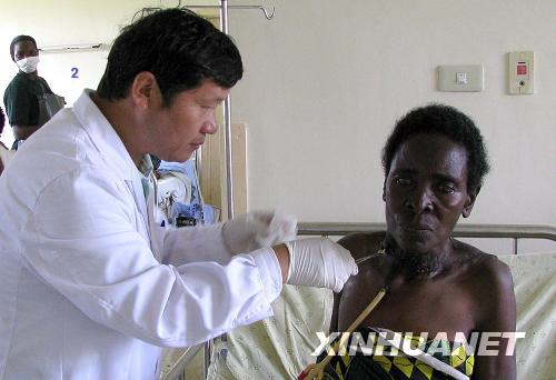 图为2008年12月24日,中国援助马拉维医疗队的医生在马拉维首都利隆圭中心医院为患者治疗。中国援马医疗队于2008年6月抵达马拉维,在短短半年时间内,这支由7人组成的医疗队已经在马拉维接诊病人2685人,实施手术702例,培训马方人员109人,为提高马拉维医疗水平、增进中马两国友谊作出积极贡献。马拉维是地处非洲东南部的内陆国家,2007年12月28日,中马两国建立外交关系。新华社记者徐速绘摄