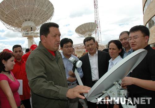 1月10日,在委内瑞拉北部瓜里科州埃尔松布雷罗的巴马里地面卫星主站,中国长城工业总公司总裁王海波(右)向委内瑞拉总统查韦斯(前左)介绍中国生产的用户端卫星接收天线。当天,中国长城工业总公司在巴马里地面卫星主站向委内瑞拉政府在轨交付委内瑞拉一号通信卫星(“委星1号”)以及相关地面设备。“委星1号”于北京时间2008年10月30日在中国西昌卫星发射中心发射升空。这是中国首次向拉丁美洲用户提供整星出口和在轨交付服务。新华社记者张笑然摄