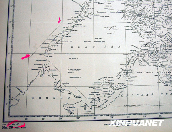 这张由菲律宾海岸与地质勘测部门编制、1967年5月出版的菲律宾官方地图显示,南沙群岛岛礁明显在菲国界线之外(摄于2009年2月23日)。新华社记者许林贵摄