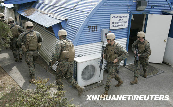 3月9日,在韩国首都首尔东南410公里的镇海美军基地,美国海军陆战队太平洋反恐安全小组参加演习。