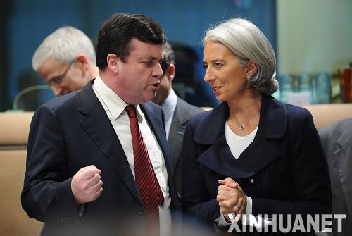 3月9日,在比利时首都布鲁塞尔欧盟总部举行的欧元区财长会议上,法国经济、财政与就业部长克里斯蒂娜·拉加德(右)与爱尔兰财政部长布赖恩·勒尼汉交谈。欧元区财长会议当天在布鲁塞尔举行。新华社记者武巍摄