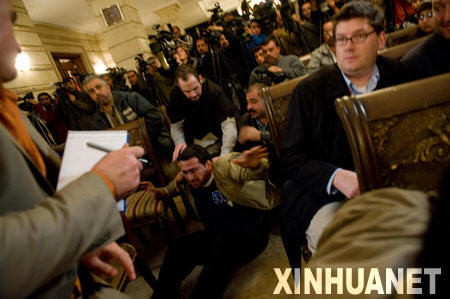 这张摄于2008年12月14日的资料照片显示伊拉克记者蒙塔兹·扎伊迪(中)在伊拉克首都巴格达举行的一场记者招待会上向美国总统布什扔鞋后被按倒在地。2009年3月12日,伊拉克一法院判处向美国前总统布什扔鞋抗议的伊拉克记者蒙塔兹·扎伊迪3年有期徒刑。新华社发