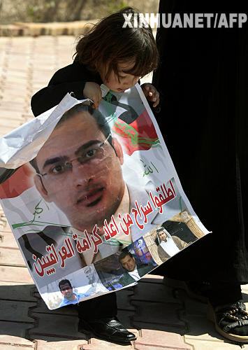 3月12日,在位于伊拉克首都巴格达的伊拉克中央刑事法院外,一名儿童手拿向美国前总统布什扔鞋抗议的伊拉克记者蒙塔兹·扎伊迪的海报。当日,伊拉克中央刑事法院判处蒙塔兹·扎伊迪3年有期徒刑。新华社/法新