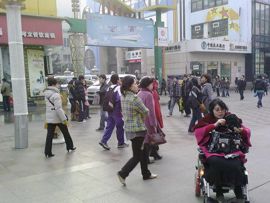 “救救这个22岁的新娘子吧,谢谢你的爱心。”残疾人刘冰心坐着电动轮椅在山东青岛市区为白血病新娘高俊峰奔走呼告,筹集“善款”。