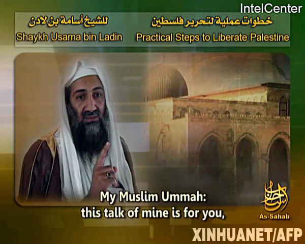 这张3月14日由美国机构“情报中心”(IntelCenter)发布的图片显示的是“基地”组织头目乌萨马·本·拉丹。“基地” 组织的媒体机构“云”(as-Sahab)发布了一段长33分39秒的本·拉丹讲话录音,讲话题为“解放巴勒斯坦的实际步骤”,讲话中指责了一些阿拉伯国家领导人,称他们与以色列“合谋”对巴勒斯坦加沙地带发动大规模打击。 新华社/法新