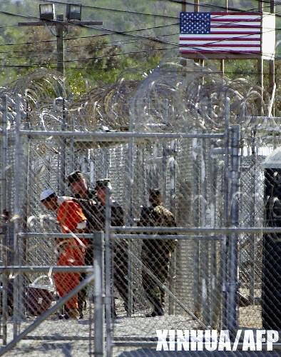 这张拍摄于2002年2月10日的资料照片显示,一名被关押在关塔那摩的囚犯被美军士兵押出牢房。
