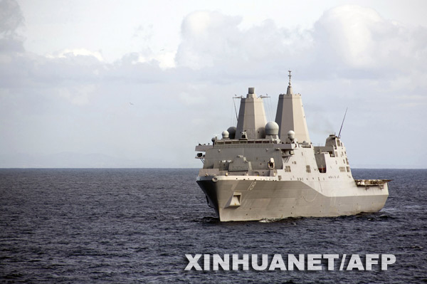 这张美国海军提供的照片显示的是2008年11月4日,两栖船坞运输舰“新奥尔良”号在执行任务。美国海军第五舰队2009年3月20日说,美国海军一艘潜艇和这艘两栖船坞运输舰当天在霍尔木兹海峡相撞,造成15名船员受伤。新华社/法新