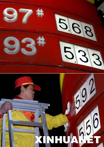 这是调整前的97号、93号汽油价格(上)和调整后的价格(下)。国家发展改革委24日宣布,鉴于近期国际市场原油价格持续上升,根据完善后的成品油价格形成机制,决定自3月25日零时起将汽、柴油价格每吨分别提高290元和180元。调整后97号汽油每升为5.92元,上涨0.24元;93号汽油每升5.56元,上涨0.23元。 新华社记者公磊摄