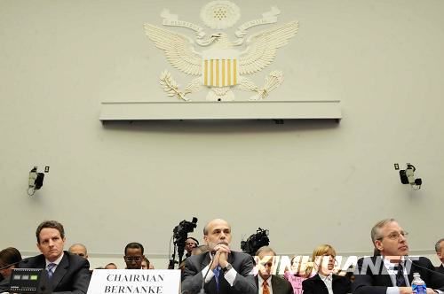 3月24日,美国财政部长盖特纳(左一)、美联储主席伯南克(中)和纽约联邦储备银行总裁兼CEO威廉姆·达德利在华盛顿国会山出席众议院金融委员会举行的听证会,就美国国际集团(AIG)奖金一事接受国会众议员的质询。新华社记者张岩摄