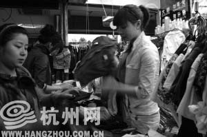 营业员卖出衣服后,要带一句吉利话:好生意,还要不时换穿新款衣服。穿得好不好看关系很大,所以四季青的商户门口,经常看到“招聘靓女”的牌子。这里没有换衣间,营业员用布裹起身体换衣服,一两分钟就能搞定。