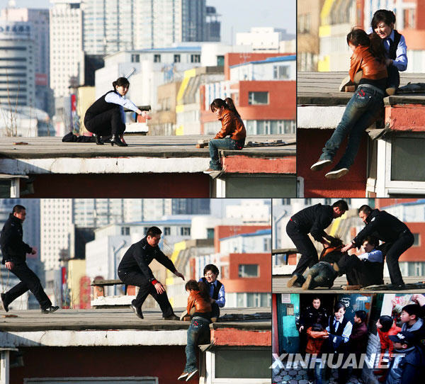 这是王玉辉成功解救轻生女孩的几个瞬间(拼版照片)。新华社发(牛研 摄)