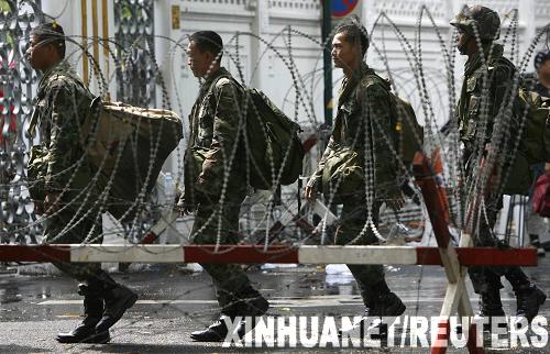 3月31日,军人在泰国首都曼谷的政府大楼前警戒。泰国反独裁民主联盟(反独联)在曼谷组织的大规模反政府集会当日进入第六天,反独联的支持者继续包围总理府,迫使泰国政府取消了本应在当天举行的每周内阁会议 新华社/路透