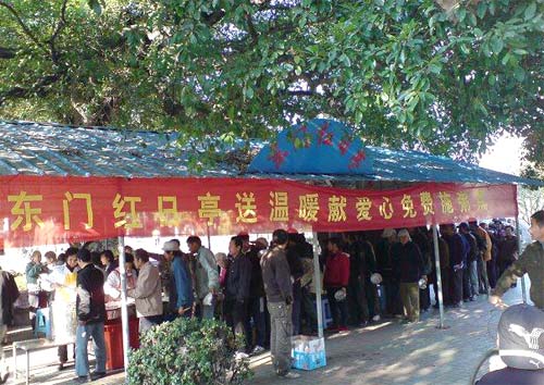 这时施粥摊前已经排起了百来人的长队。从今年大年初五开始,在义乌打拼多年的温州老板林如新开办的施粥摊已经坚持了65天,“每天要分掉1000碗粥,2000个馒头。”