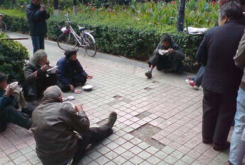 贫困的人端着冒热气的粥蹲坐在四周吃 (资料图)