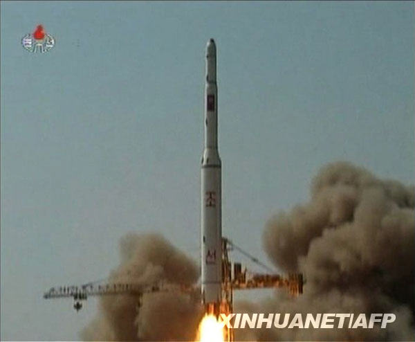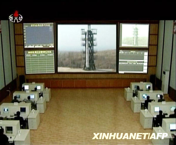 朝鲜中央电视台4月7日傍晚播出5日发射活动的现场画面。这是发射画面的视频截图。新华社/法新