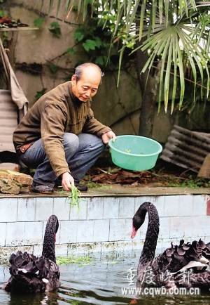 昨日,在北碚区施家梁镇一院坝中,看着在池塘里悠闲游泳的黑天鹅,55岁的王国华愁眉不展。