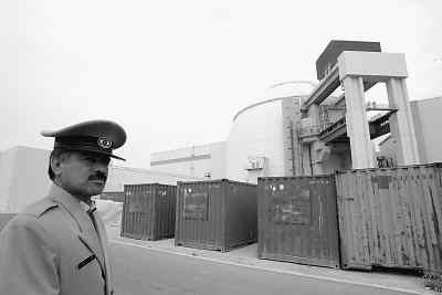 伊朗不久前对由俄罗斯承建的布什尔核电站进行测试运行,以对这座仍未最后完工的核电站进行初步的性能测试。图为一名保安人员在布什尔核电站的反应堆前值勤。