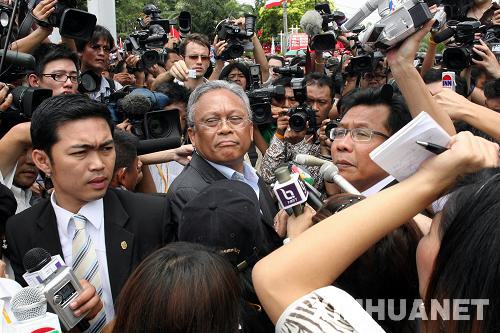 4月10日,泰国副总理素贴(中)在帕塔亚集会现场了解情况。泰国副总理素贴当天中午在帕塔亚说,泰国政府已准备好与前往帕塔亚集会的泰国反独裁民主联盟示威者对话。新华社记者张凤国摄
