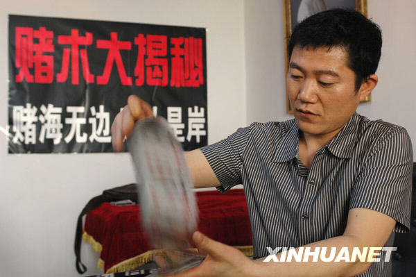 今年32岁的马洪刚出生在辽宁盘锦市一个普通的农村家庭,无数次赌海沉浮后,他练就高超“赌术”。但在一次次亲眼目睹朋友倾家荡产、妻离子散后,他幡然悔悟,在沈阳开办反赌俱乐部,揭开“千术之秘”,劝那些好赌之人戒赌。新华社记者 姚剑锋 摄