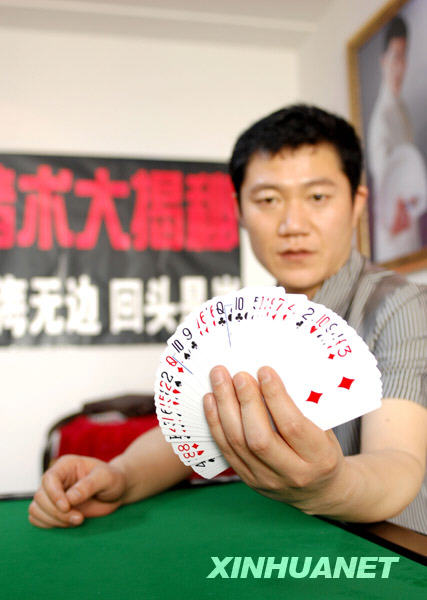 4月10日,马洪刚在他的反赌俱乐部里向记者展示他的牌术。