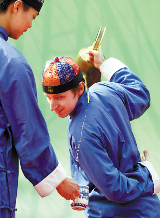 美国小伙周易(英文名Joey)一亮相就吸引了人群的注意力。就见他蓝布长衫瓜皮帽,左手叉腰,右手提壶,歪着头顽皮地迈上台,一招“猛龙过江”步子稳扎,手臂有力,茶水一滴不洒地倒入杯中。周易的师傅说,这个高鼻子留学生拜师在河坊街茶馆学艺,才学了三个月已经很像模像样了。