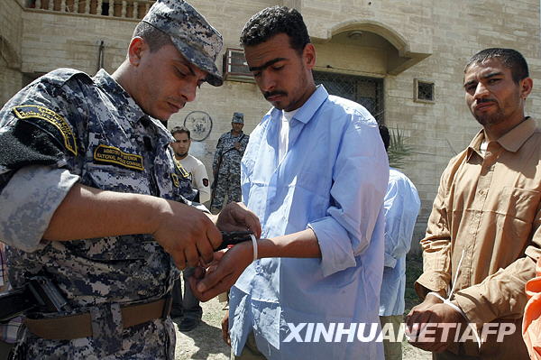 4月13日,在伊拉克首都巴格达,一名伊拉克警官打开一名囚犯的手铐。新华社/法新
