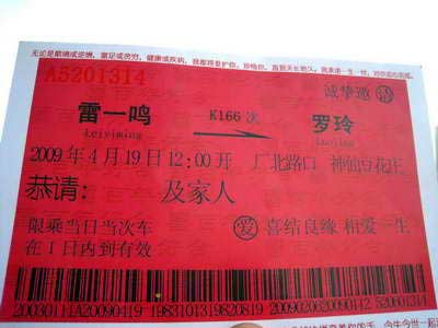 “太牛了,简直就是个牛人。”昨日中午11时多,在婚礼现场,新郎的好友杨先生拿着明信片大小的“火车票”对记者说,原来来宾们手中所持的“火车票”都是结婚请柬,是由新郎雷一鸣自己设计的。